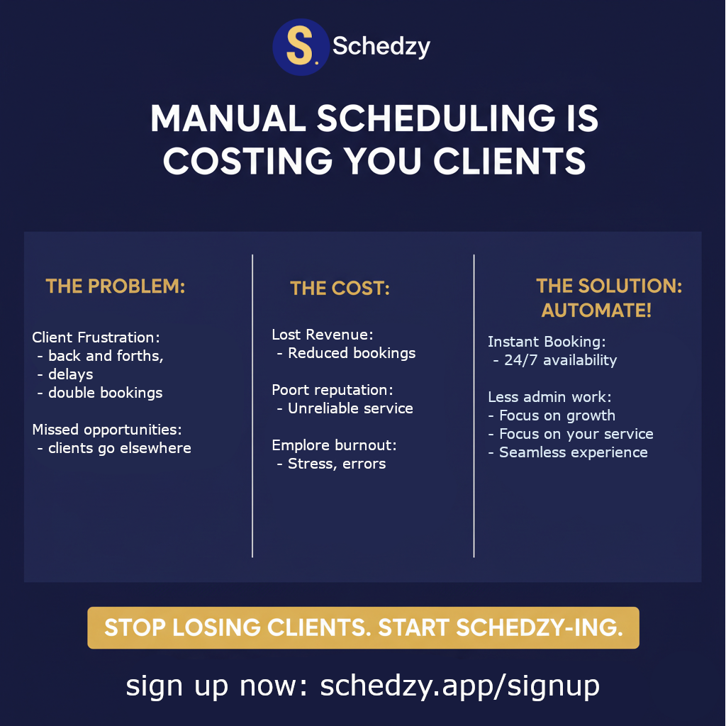 Manual scheduling isn't just inconvenient; it puts your business at risk of losing clients and revenue. By embracing Schedzy’s robust features, you can transform your scheduling process into a streamlined, efficient, and client-friendly system.